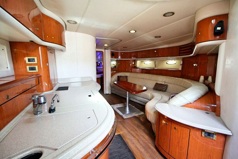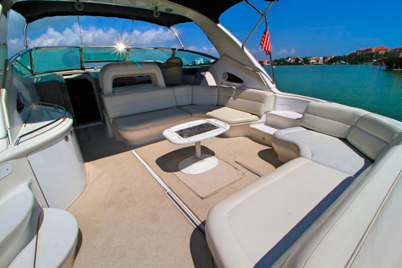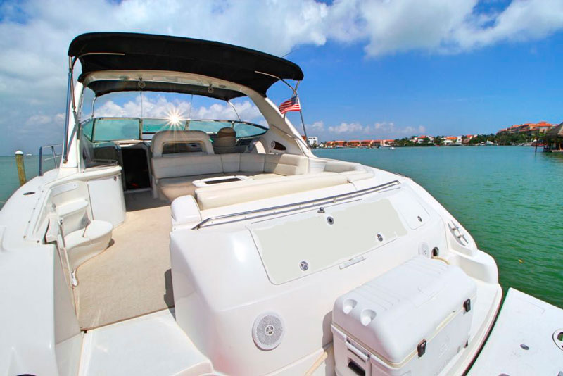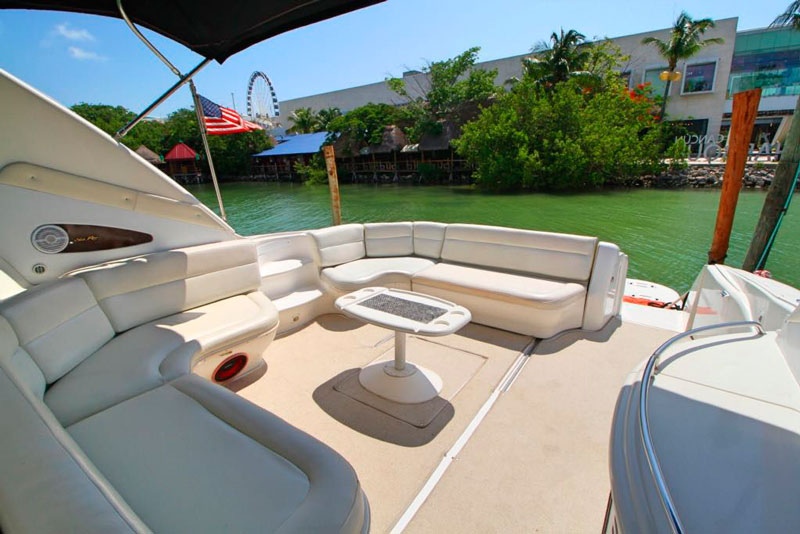 Discover purpose-engineered versatility and performance in the 60 Sundancer, from the hardtop with two retractable sunroofs, to the wet bar with icemaker and available entertainment amenities, to the sun pad with adjustable "sun gate" backrest. Interior elegance comes in the form of two staterooms and two heads with new interior fabrics and finishes, private boat rentals cancun.